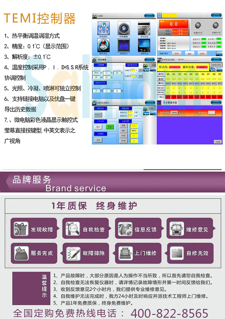 紫外线老化试验箱特点:1、箱体材料和其他部件均采用采用进口SUS304不锈钢板材,美观不腐蚀2,设备采用水加热方式,保持内部100%的湿度要求。特殊设计的自动补水和水自溢系统非常方便实用。3、具有断电记忆功能,复电时可继续剩余之试验过程4、具有P.